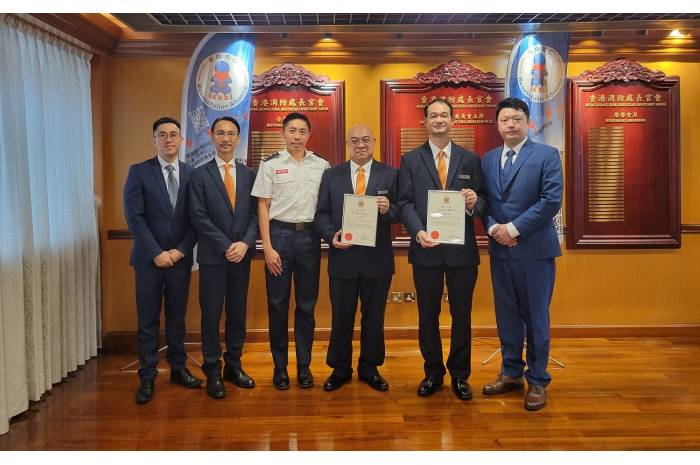 Fire Services Department has presented commendation certificates to two frontline colleagues in recognition of their initiative in performing cardiopulmonary resuscitation and defibrillation on a cardiac arrest patient at Citywalk on 20 Nov 2022 which contributed to the patient’s survival.